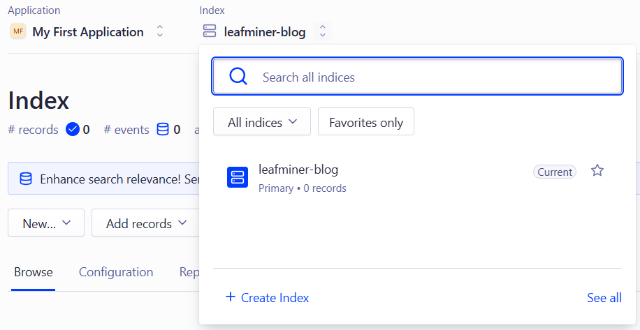 新建一个Index,这里创建了一个名为leafminer-blog的索引。