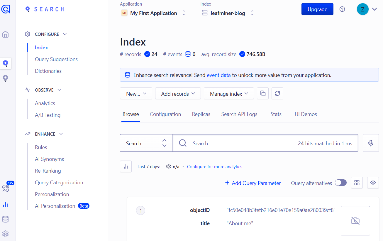 使用插件提供的命令来推送你的内容到Algolia。在 hexo站点根目录下执行hexo algolia 来搜集数据更新到我们刚创建的 Index 中,我们可以在网页中看到所有的数据,如下图: