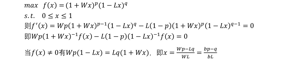 凯利公式定义了长期获得最高的盈利的仓位确认的计算方法,我们自己也可以按照凯利公式的数学定义,进行推到一下。