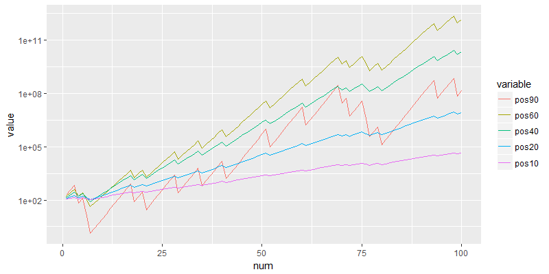 我们看到,只是简单地调整了交易的仓位比例,那么交易10次后,你剩余的现是就是有很大的不同的。其中pos60列,即60%仓位的交易,获得的回报最高为687元,而90%的仓位获得的回报,是这里面最少的。而且非常有意思的是,后面的4种仓位设置,每次交易后的资金都大于100元的原始本金。