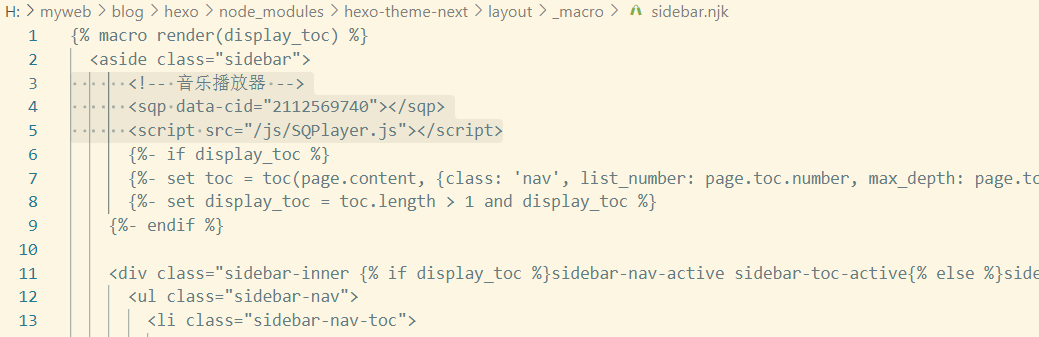 修改\node_modules\hexo-theme-next\layout_macro\sidebar.njk文件,添加<script src="SQPlayer.js"></script>