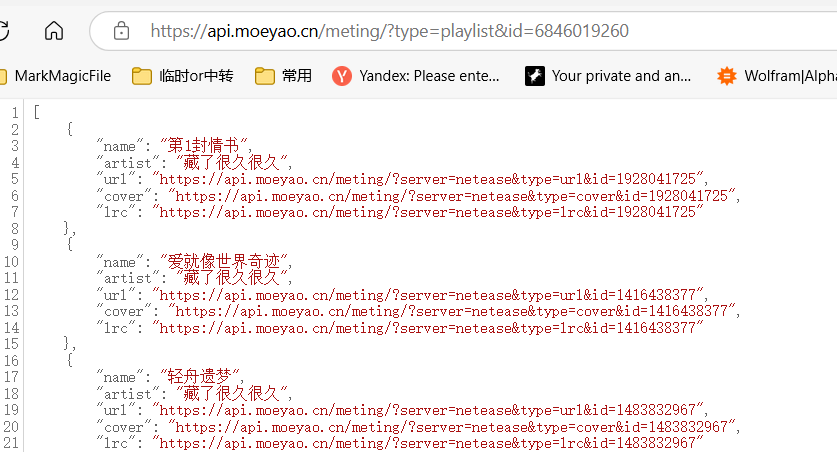 将该ID填写到https://api.moeyao.cn/meting/?type=playlist&id=连接中,可查看到返回的Json数据。