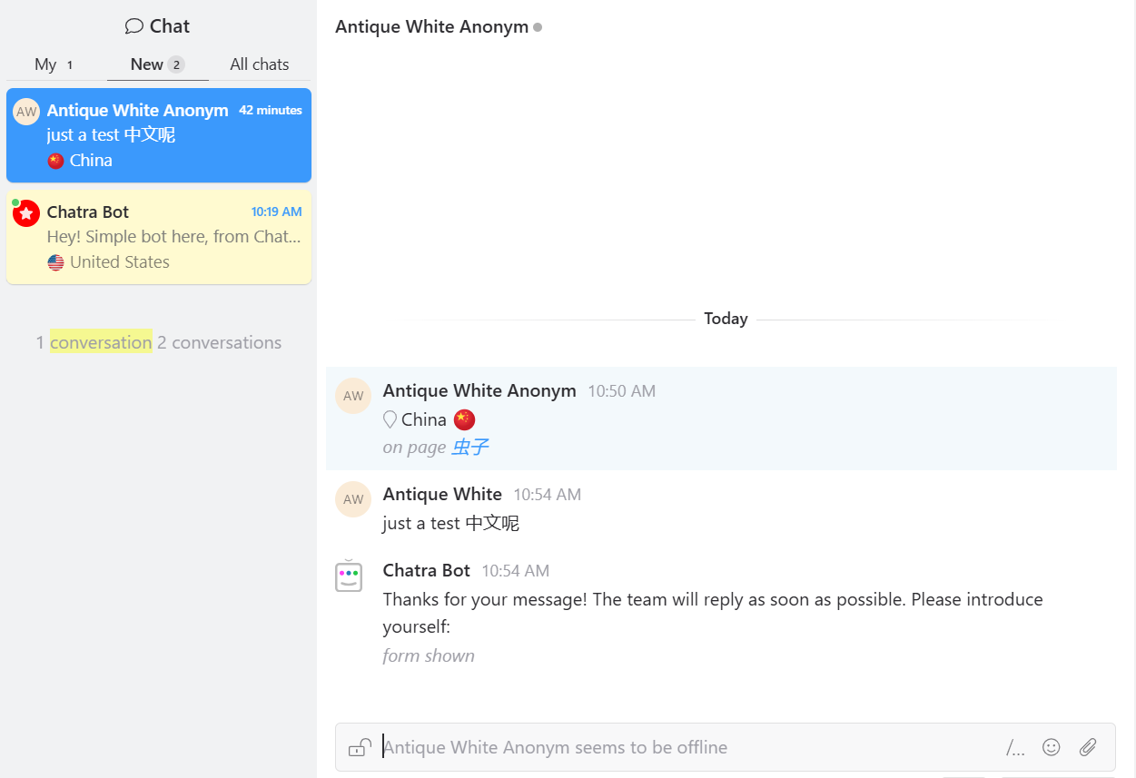 在主页上添加Chatra-聊天挂件 发表于 2025-01-04 更新于 2025-01-10 分类于 原创 , 其他 阅读次数: Changyan: 本文字数: 137 阅读时长 ≈ 1 分钟 因:在壹拾肆的博客中看到聊天挂件,我也想有一个。 简介:这里用免费版的,限制挺多,比如每个月只能 20 条消息。使用起来不麻烦,注册一个账号就好了,免费版的提供了JavaScript 代码,插入到网页中就行,根据需要可以调整图标、位置等。官网在这:Chatra by Brevo Hexo博客Next主题配置文件中有对应的开关,只需要打开就行 效果如下: 测试一下,收到的消息: